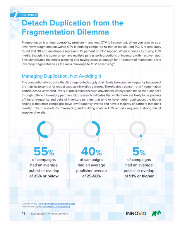 To help decode CTV measurement and uncover the truth behind common CTV myths, the ANA and Innovid conducted an unprecedented study across 20 leading U.S. advertisers, including Anheuser-Busch, General Motors, and Southwest. We sought to understand whether CTV could be a significant driver of reach, whether fragmentation led to issues with duplication, and whether excessive frequency was a prevalent issue. We also took on the Herculean task of estimating the true ROI of CTV.