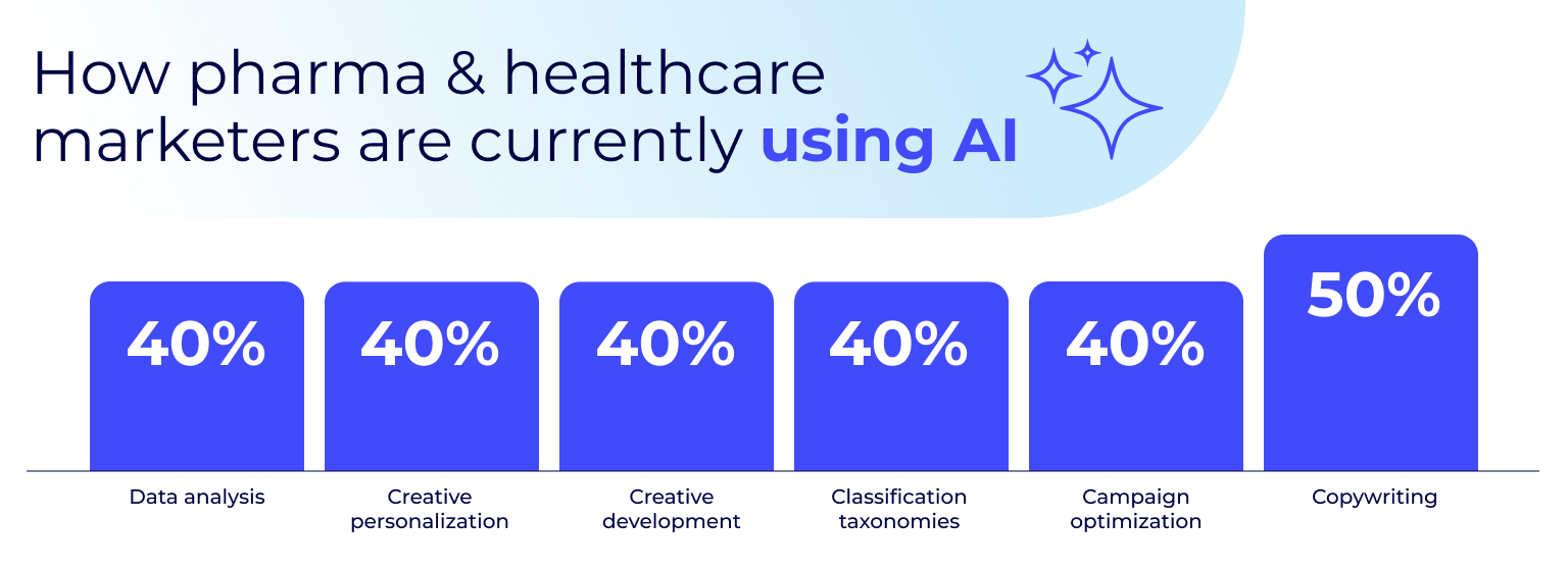 Pharma and healthcare marketers are applying AI broadly across workflows, with copywriting (50%) leading adoption, followed by campaign optimization, creative development, and data analysis (40% each). AI increasingly supports content production, campaign personalization, and operational efficiency as campaign complexity and requirements grow.