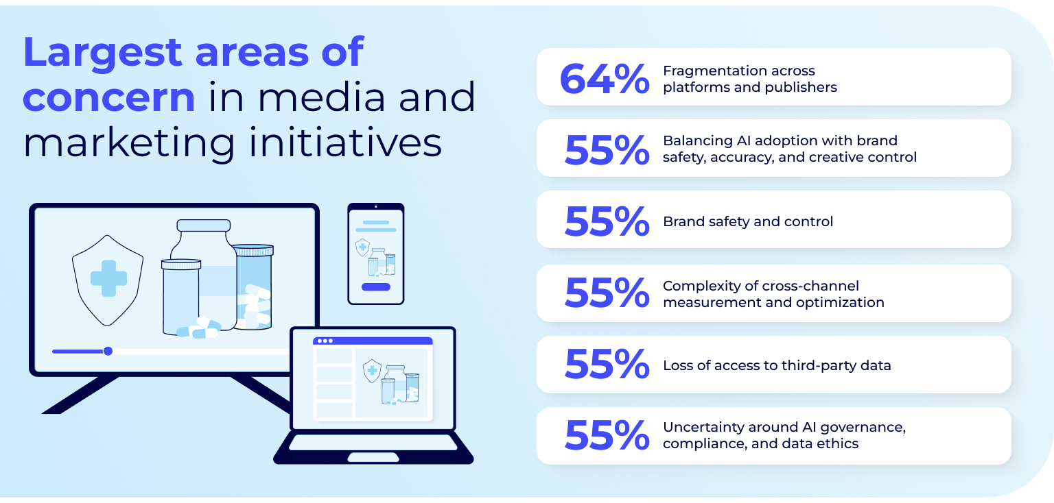 Pharma and healthcare marketers cite fragmentation across platforms and publishers (64%) as their top challenge, followed by concerns around balancing AI adoption with brand safety (55%), maintaining brand safety and control (55%), and managing cross-channel measurement complexity (55%). Marketers also highlight risks tied to the loss of third-party data and uncertainty around AI governance and compliance (both 55%), underscoring the need to maintain effective, compliant engagement strategies.