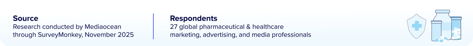 Pharma and healthcare marketers continue to prioritize measurement and attribution (64%) alongside performance-driven media (55%) to ensure investments deliver outcomes. The rising importance of AI and cross-platform orchestration (both 45%) shows growing focus on connecting insights and activation across campaigns while maintaining compliance and control.